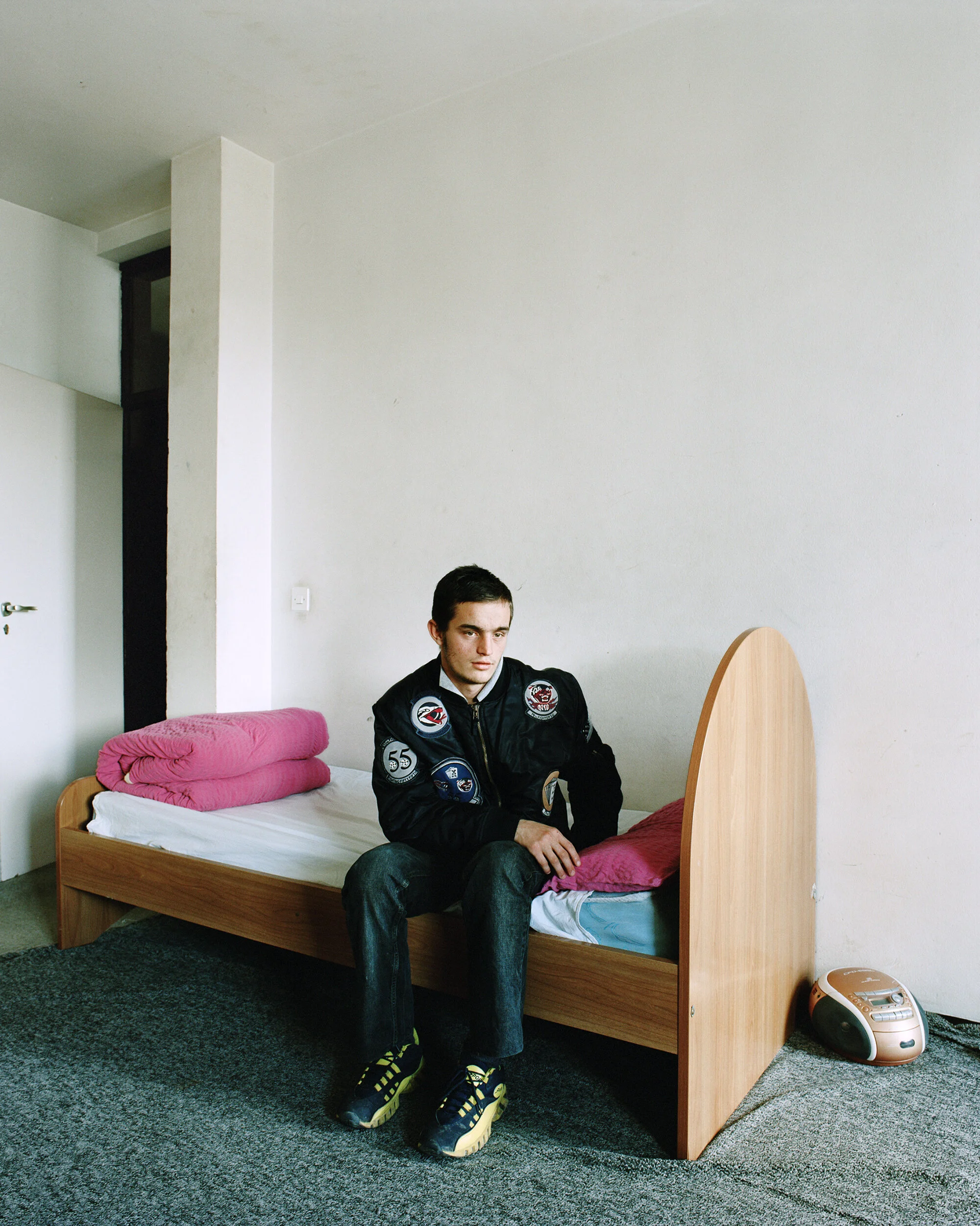 The photographs show young women and men in their current environments and with the few objects that they possess. The emptiness around them and the utter impossibility of their situations are however very present and emotionally charged. Past presents future – the title of this work expresses an aspect of time, which appears in this context to belong exclusively to the process of scarification. No longer and not in its entirety, the issue here is one of threshold such for these young people busy growing up. In this series, motifs of the threshold and borders appear over and over again. In every image there is a door, a window, a curtain or a carpet, which reminds of a different time and a different place and simultaneously obfuscates. Behind the closed door, hidden by a curtain or swept under the carpet – there is always something more. In this way the scar is a symbol for that thing that it hides.